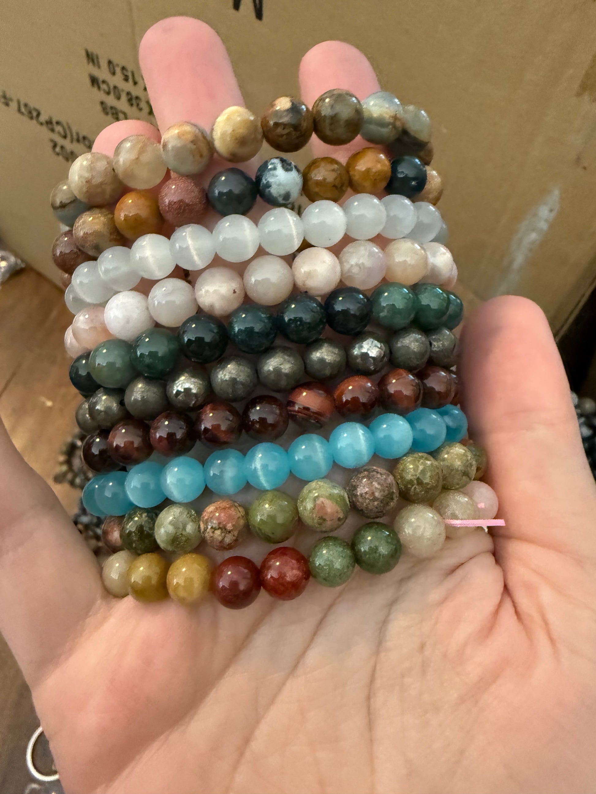 Mixed materials. Almost all of these are round bead standard 8mm bracelets. A few random 10mm bead bracelets. All included bracelets are pictured.